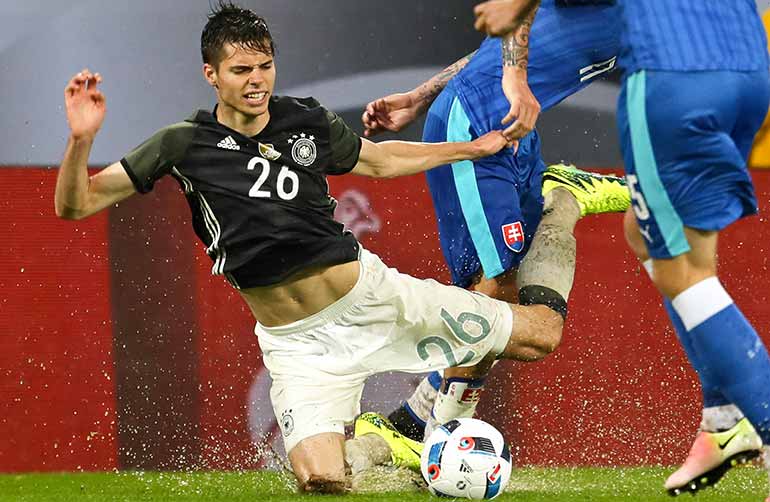 Après avoir tranquillement géré son groupe malgré la frayeur polonaise, la NM n’a eu aucun problème en 8es face à la limitée Roumanie, emportée par un doublé de Julian Brandt, révélation du tournoi. En quarts contre la Belgique, Wilmots et Löw étaient clairement sur la même longueur d’ondes, avec 4 défenseurs centraux de chaque côté (Mustafi, Boateng, Hummels, Höwedes, contre Alderweireld, Lombaerts, Vermaelen, Vertonghen). Sauf que le Belge avait décidé d’aligner 3 attaquants axiaux quasi jumeaux, là où Jogi multipliait les milieux caresses. Suffisant pour se faire arracher les cheveux à Fellaini et Witsel. Score sans appel, 3-1, Götze, Brandt, Özil, Michy sauvant l’honneur en fin de match avant de signer à Hull. En demies, c’est rebelote de 2014. Cette fois, la France est chez elle, et Varane n’est pas là. Sur le premier corner, Mamad Sakho, blanchi de dernière minute, fracasse le crâne d’Hummels et la lucarne de Neuer. Et derrière, la France, héroïque à l’image d’un Christophe Jallet aligné milieu droit, bétonne vers sa finale. Pour le plus grand plaisir de Lionel.