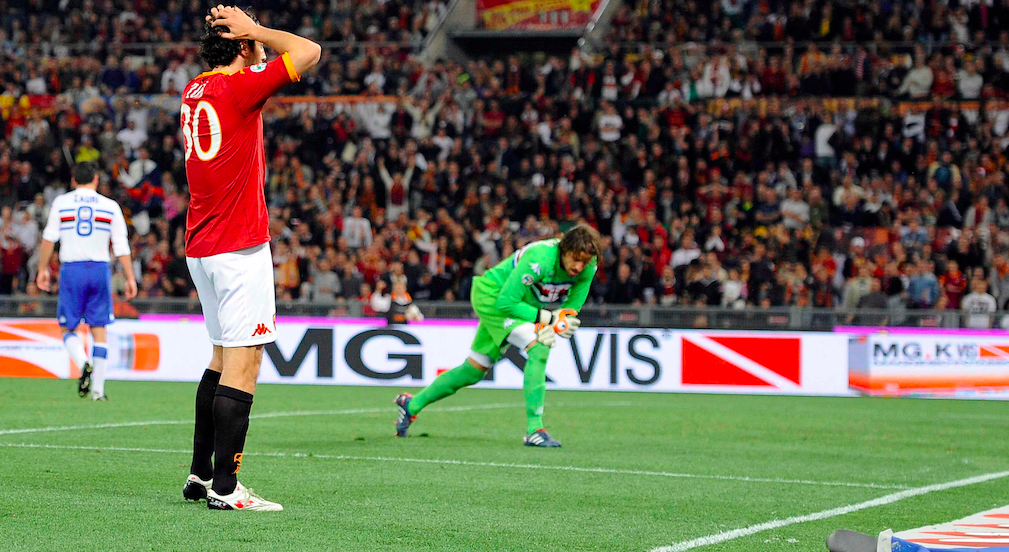 Si près, si loin. Une formule récurrente dans l’histoire de la Roma. Le 25 avril 2010, elle s’incline 2-1 à domicile face à la Sampdoria et dit adieu au Scudetto après être pourtant passée devant l’Inter à quelques journées de la fin du championnat.